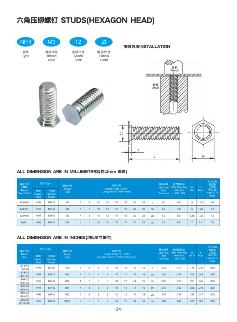 Stainless steel Carbon steel hexagon self-clinching studs NFH,NFHS